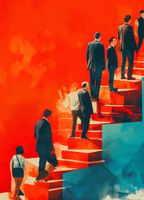 Plakat z serii abstrakcja zatytułowany Metafory Sukcesu. Przedstawia on różne postacie w formalnym ubiorze, wchodzące i schodzące po schodach, które rozdzielają się i zbiegają w różnych kierunkach. Tło plakatu jest podzielone na dwie kontrastujące strony - jedna w odcieniach czerwieni, a druga w chłodnych błękitach, symbolizując różne ścieżki i wybory w życiu zawodowym lub osobistym. Styl graficzny łączy elementy abstrakcyjne i figuralne, a silne kontrasty kolorystyczne podkreślają dynamikę i złożoność podejmowanych decyzji. Plakat ten mógłby być inspirującym dodatkiem do biura lub przestrzeni pracy, zachęcającym do refleksji nad własnym rozwojem i aspiracjami.