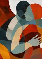 Plakat z serii abstrakcja zatytułowany Objęcia. Artystyczne przedstawienie dwóch postaci w uścisku, z wyraźnymi, płynnymi liniami i bogatą paletą kolorystyczną od ciepłych pomarańczy po chłodne odcienie błękitu i szarości. Grafika ta łączy abstrakcję z emocjonalną głębią, sugerując intymność i ciepło relacji. Idealnie komponuje się w nowoczesnych przestrzeniach mieszkalnych lub jako wyrazisty akcent w kreatywnych biurach. Ten plakat może również znaleźć miejsce w galeriach sztuki oraz w pomieszczeniach przeznaczonych do medytacji i refleksji, zachęcając do zastanowienia nad ludzką bliskością i uczuciami.