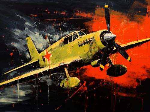 Plakat z serii abstrakcja zatytułowany Barwny Przelot. Plakat prezentuje dynamiczną scenę z klasycznym samolotem wojskowym na tle dramatycznego, ekspresyjnego nieba. Maszyna jest wyraźnie zaznaczona, z widocznymi detalami konstrukcyjnymi i oznaczeniami gwiazd, które sugerują przynależność do sił powietrznych. Tło plakatu jest pełne energii, z intensywnymi pociągnięciami pędzla i abstrakcyjnymi plamami farby w odcieniach czerwieni, czerni i bieli, co nadaje scenie uczucie ruchu i chaosu bitwy. Styl ten może odzwierciedlać dynamiczną naturę lotniczego manewru lub intensywność doświadczeń bojowych. Plakat ten mógłby stanowić mocny akcent w każdym wnętrzu, zwłaszcza tam, gdzie chce się oddać hołd historii lotnictwa lub militarnej odwadze.