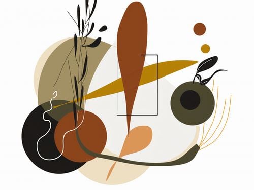 Plakat z serii minimalistyczne zatytułowany Ekspresja w Impresji. Ten plakat przedstawia złożoną kompozycję abstrakcyjnych kształtów, linii i form botanicznych, tworząc spójną całość w paletcie beżu, brązu, czerni i ochry, z akcentami w odcieniach ciepłego żółtego. Gra kształtów i linii jest równocześnie dynamiczna i harmonijna, nadając plakatowi nowoczesny i artystyczny wygląd.Grafika będzie świetnie wyglądała w nowoczesnych i minimalistycznych przestrzeniach, które korzystają z neutralnych barw i akcentują formę nad kolorem. Doskonale nadaje się do biur o kreatywnym charakterze, salonów czy przedpokoi, które pragną wnieść sztukę współczesną do swojego wnętrza.