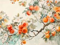 Plakat z serii abstrakcja zatytułowany Persymony. Przedstawia delikatną i kolorową ilustrację gałęzi owocowych w stylu azjatyckiej akwareli. Na obrazie widzimy rozkwitające kwiaty oraz dojrzałe, soczyste owoce persymony których intensywna pomarańczowa barwa jest pięknie wyeksponowana na tle pastelowych kolorów. Liście i gałęzie są przedstawione z subtelnymi niuansami zieleni i brązów, co dodaje głębi i naturalnego charakteru scenie. Ta sztuka łączy w sobie tradycyjne motywy i techniki malarskie z nowoczesnym podejściem do koloru i kompozycji, co czyni ją zarówno klasyczną, jak i współczesną. Plakat ten idealnie nadawałby się do przestrzeni, które cenią spokój i harmonię, takich jak salony relaksacyjne, gabinety spa, czy jako wyrafinowany akcent w domowej jadalni.