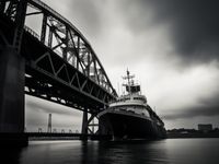 Plakat z serii pejzaże zatytułowany Statek przy Moście. Monochromatyczne przedstawienie statku pod imponującym mostem, gdzie struktury inżynieryjne łączą się z dynamicznym niebem, tworząc kompozycję symbolizującą siłę i postęp. Chłodna paleta barw i silne linie prowadzące oko przez obraz idealnie nadają się do nowoczesnych przestrzeni biurowych lub urbanistycznych salonów. Plakat ten przyciąga uwagę i inspiruje, odzwierciedlając majestat i piękno konstrukcji stworzonych przez człowieka.