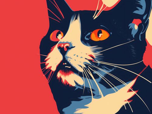 Plakat z serii abstrakcja zatytułowany Szok. Plakat przedstawia zbliżenie na twarz kota w stylizowanej, graficznej formie. Przeważającym kolorem jest intensywny czerwony, który stanowi tło dla sylwetki kota. Wyraziste, żółte oczy zwierzęcia przyciągają uwagę, a ich niemal hipnotyzujący wzrok jest skierowany ku widzowi. Wizerunek kota jest zróżnicowany kolorystycznie: od ciemnych odcieni, poprzez szarości, aż po żywe akcenty błękitu i pomarańczy, które dodają dynamiki i głębi. Detale takie jak wąsy i futro są wyraźnie zaznaczone białymi i niebieskimi liniami, co nadaje ilustracji ruch i teksturę. Całość kompozycji ma współczesny, prawie popartowy charakter, przyciągając wzrok i wzbudzając emocje. Jest to dzieło, które mogłoby znaleźć miejsce w nowoczesnych przestrzeniach, podkreślając miłość do zwierząt i sztuki.