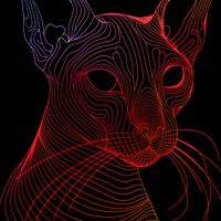 Plakat z serii pop art zatytułowany Cyfrowa Kocica przedstawia futurystyczny wizerunek kota sfinksa, wykonany za pomocą płynnych, abstrakcyjnych linii w odcieniach czerwieni i pomarańczu na głębokim, czarnym tle. Wzór linii tworzy iluzję trójwymiarowości i ruchu, podkreślając wyraziste cechy kociego profilu, takie jak duże uszy, wyłaniające się oczy i charakterystyczne rysy twarzy. Minimalistyczne użycie koloru i linii w kontraście z ciemnym tłem nadaje dziełu nowoczesny wygląd, który przyciąga wzrok i pobudza wyobraźnię. Ten artystyczny plakat świetnie wpisze się w wnętrza o nowoczesnym designie, szczególnie wśród miłośników zwierząt i miłośników sztuki cyfrowej, nadając przestrzeni odrobinę współczesnego stylu i kociego wdzięku.