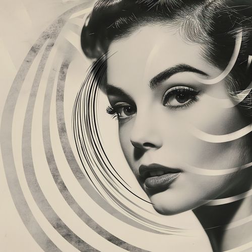 Plakat z serii pop art zatytułowany Ikonka Kina. Przedstawia czarno-białe portretowe zdjęcie klasycznej gwiazdy filmowej, której twarz jest częściowo zakryta przez geometryczny wzór spiralnych linii. Linie te dodają obrazowi dynamiki i nowoczesnego akcentu, kontrastując z retro estetyką portretu. Ten plakat łączy stare z nowym, sugerując zarówno ponadczasową piękność, jak i współczesne spojrzenie na sztukę. Idealny do eleganckich, miejskich przestrzeni lub jako dekoracja dla miłośników klasycznego kina.
