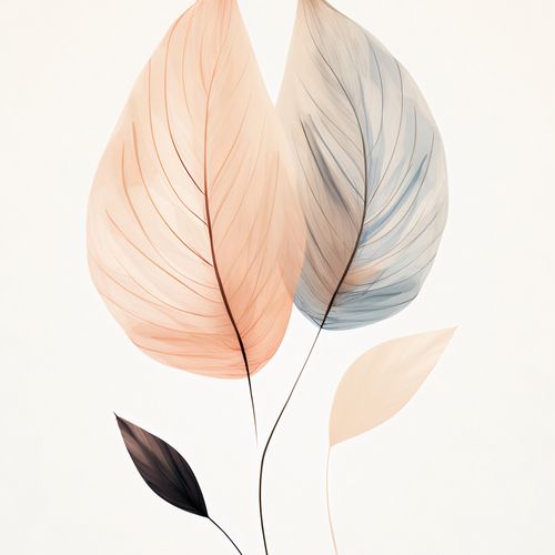 Plakat z serii wnętrza zatytułowany Liściasty Taniec. Subtelne krzywe i delikatne niuanse kolorów liści przechodzących od pastelowego różu do głębokiego szaro-niebieskiego, tworząc efekt wizualnej symfonii. Delikatność i precyzja linii liści, jak i kontrastujący ciemny liść u podstawy, dodają kompozycji elegancji i głębi. Przemyślane połączenie kolorów i kształtów emanuje spokojem i równowagą, przypominając o pięknie i prostocie natury. Idealnie wpasuje się w nowoczesne spa, minimalistyczne sypialnie oraz w przestrzeniach relaksacyjnych, gdzie dominują naturalne elementy dekoracyjne.