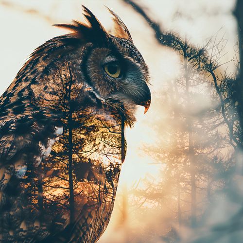 Plakat z serii natura zatytułowany Sowi Duch. Prezentuje on majestatyczną sylwetkę sowy zlewaną z tłem o zachodzie słońca w lesie, co podkreśla jej dziką naturę i instynktowną mądrość. Ciepłe odcienie zachodzącego słońca i sylwetki drzew przenikają się z delikatnym konturem sowy, tworząc wrażenie jedności z naturą. Plakat ten idealnie wpasuje się w przestrzenie takie jak gabinet, biblioteka lub salon, gdzie może inspirować do refleksji i spokoju, przypominając o głębokich, nieodkrytych aspektach natury.