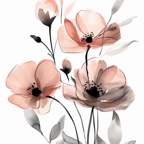 Plakat z serii wnętrza zatytułowany Subtelny Okaz to artystyczna interpretacja delikatnych kwiatów maku. Ilustracja przedstawia kwiaty w pastelowych odcieniach różu i pomarańczy z subtelnymi szarości i akcentami czerni, co nadaje kompozycji miękkiego i eterycznego charakteru. Przezroczyste płatki z lekko zarysowanymi konturami są przedstawione na tle w tonacji jasnego beżu, co pozwala na pełne skupienie na delikatności i pięknie kwiatów. Wykorzystanie minimalizmu i delikatności kolorów sprawia, że plakat emanuje spokojem i elegancją. Idealny do przestrzeni, które cenią sobie spokój i naturę, takich jak salony spa, pokoje gościnne, czy jadalnie, gdzie może dodać odrobinę subtelnego uroku i świeżości.