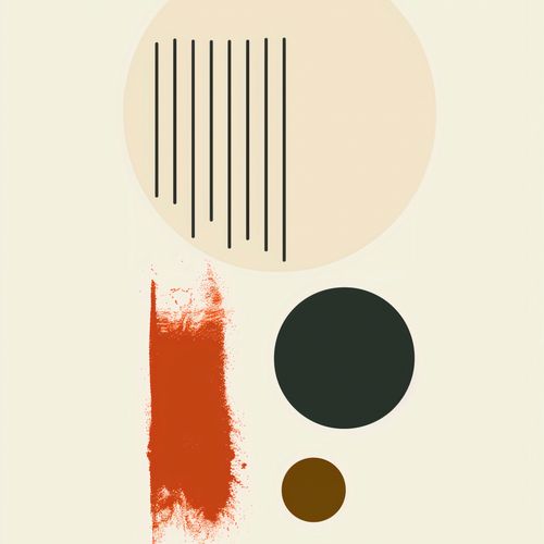 Plakat z serii boho zatytułowany Symetryczna Struna.Grafika przedstawia zrównoważoną kompozycję z surowymi elementami geometrycznymi i organicznym pociągnięciem pędzla. Kremowe tło rozświetla duże koło z rytmicznie rozmieszczonymi pionowymi liniami, które mogą symbolizować struny instrumentu lub elementy urbanistyczne. Intensywne maznięcie koloru w dolnej części obrazu dodaje energii i kontrastu, natomiast umieszczone obok czarne i brązowe kółka wprowadzają wrażenie głębi. Plakat idealnie uzupełni wnętrza w duchu minimalizmu i modernizmu, takie jak stylowe salony, gabinety, czy współczesne przestrzenie biurowe, gdzie może stanowić element kontrastujący z prostotą otoczenia.