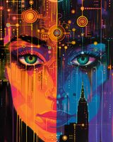 Plakat z serii abstrakcja zatytułowany Cyfrowa Psyche. Przedstawia fascynującą symetrię między ludzką urodą a technologicznym zawirowaniem. Wyraźne, zielone oczy kobiety są centralnym punktem obrazu, ożywione wizją elektronicznych obwodów i cyfrowych sygnałów, które przepływają przez i wokół jej wizerunku. Przecinające twarz linie symbolizują połączenie osobowości z nowoczesnymi technologiami, podczas gdy tło ukazuje zarys charakterystycznego krajobrazu miejskiego. Intensywne, neonowe kolory od pomarańczowego do niebieskiego nadają dziełu dynamiczny i nowoczesny charakter. Plakat ten będzie idealnym dodatkiem do współczesnych biur, salonów gier lub innych przestrzeni kreatywnych, które celebrują połączenie sztuki i technologii.