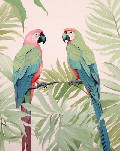 Plakat z serii wnętrza zatytułowany Dialog Ara. Na tej jasnej i pełnej życia ilustracji widzimy dwie papugi ary, które z gracją spoczywają na gałęzi, otoczone tropikalnymi liśćmi palm. Ich wyraziste, kolorowe upierzenie w odcieniach różu, zielonego i błękitu przyciąga wzrok i wprowadza egzotyczną atmosferę do każdej przestrzeni. Plakat ten jest idealnym wyborem dla miłośników natury i kolorowych, radosnych motywów, doskonale nadaje się do wnętrz, które pragną dodać odrobinę tropikalnego ciepła, takich jak jasne salony, dziecięce pokoje, a także jako dekoracja w kawiarniach i restauracjach o egzotycznym charakterze.