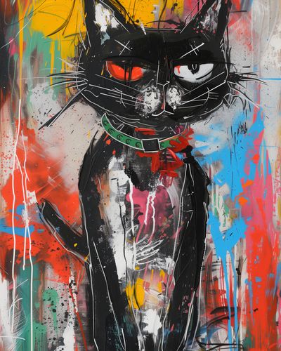 Plakat z serii abstrakcja zatytułowany Gburowaty Kiciak to odważne, street artowe przedstawienie czarnego kota z intensywnymi, czerwonymi oczami. Postać kota, zarysowana grubymi, dynamicznymi liniami, wyróżnia się na tle żywego, kolorowego graffiti. Dzieło łączy w sobie surowość miejskiego stylu z komicznym przedstawieniem zwierzęcia, co nadaje mu niepowtarzalny charakter. Drobne białe akcenty na sierści kota oraz wyraziste spojrzenie tworzą efekt, który przyciąga i utrzymuje wzrok obserwatora. Ten plakat, pełen energii i miejskiego ducha, doskonale odzwierciedla współczesną kulturową estetykę i będzie stanowił wyrazisty element dekoracyjny w nowoczesnych przestrzeniach takich jak loftowe apartamenty, kawiarnie i przestrzenie kreatywne.