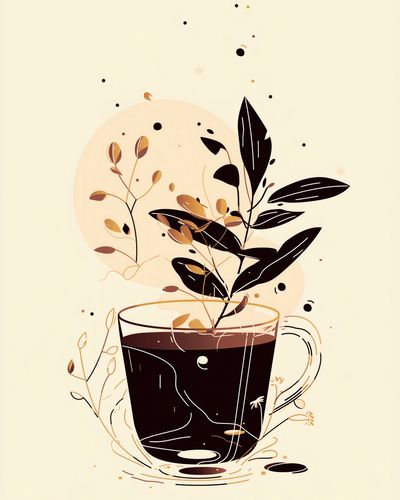 Plakat z serii minimalistyczne zatytułowany Jesienna Donica. Na plakacie widzimy czarną filiżankę pełną aromatycznej kawy, z której wyłania się roślinność w barwach jesieni. Tło w pastelowych beżach i brązach tworzy przytulną atmosferę, a drobne kropki i plamy nadają kompozycji dynamiki. Grafika oddaje ciepło i przytulność chłodniejszych dni, zapraszając do delektowania się chwilą w spokoju domowego zacisza. Idealny do wnętrz, które cenią sobie ciepłe akcenty i klimatyczne detale, pasuje do kawiarni, kuchni, lub jako element relaksującej przestrzeni w salonie.