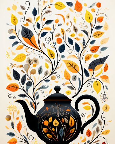Plakat z serii wnętrza zatytułowany Jesienna Melodia. Czarny dzbanek do herbaty, zdobiony subtelnymi złotymi i pomarańczowymi wzorami, z którego wyrastają kolorowe liście i kwiaty, przypominające jesienny ogród pełen życia. Kompozycja wypełniona jest ciepłymi barwami złota, pomarańczy i brązu, które kontrastują z eleganckim czernią dzbanka. Te detale dodają obrazowi nuty elegancji i spokoju. Świetnie sprawdzi się w herbaciarniach, księgarniach jak i również w domowych salonach czy biblioteczkach.