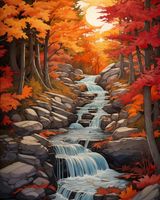 Plakat z serii pejzaże zatytułowany Jesienne Wodospady. Ten malowniczy obraz przedstawia serię kaskadowych wodospadów otoczonych przez bujne, jesienne lasy w pełni złotego sezonu. Odcienie pomarańczy, czerwieni i żółci liści klonu tworzą ciepłą paletę barw, która kontrastuje z chłodnym błękitem rwących wód. Słońce wschodzące na horyzoncie dodaje głębi i blasku całej scenie, evokując uczucie spokoju i odnowy. Idealny do ozdoby każdego wnętrza, szczególnie tych, które chcą przynieść elementy zewnętrznej zmienności i naturalnego piękna do środowiska domowego.