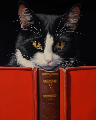 Plakat z serii wnętrza zatytułowany Koci Uczeń. Prezentuje on uroczego, czarno-białego kota z intensywnie żółtymi oczami, zaglądającego ciekawie do czerwonej, otwartej książki. Głęboki czarny tło podkreśla barwy i szczegółowe detale futra kota, a także złocenia na grzbiecie książki. Ten plakat łączy w sobie humor i ciepło, doskonale oddając osobowość i charakter kotów jako towarzyszy domowych. Idealny do umieszczenia w domowych bibliotekach, salonach czy pokojach dziecięcych, plakat ten dodaje wnętrzu przytulności i wprowadza zabawny, intelektualny element.