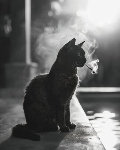 Plakat z serii wnętrza zatytułowany Kocia Przerwa. Na tym plakacie uwieczniono czarnego kota siedzącego na krawędzi, zanurzonego w promieniach rozproszonego światła, które podkreślają jego błyszczącą sierść i wyraziste kontury. Kocie wąsy delikatnie zarysowane w kontraście ze światłem nadają mu wyrazistości, a unoszący się dym tworzy aurę tajemniczości. Jest to plakat zarówno elegancki, jak i zagadkowy, idealny dla miłośników zwierząt i minimalistycznego designu. Plakat ten będzie pasował do każdego wnętrza, od klasycznego po nowoczesne, dodając subtelnego charakteru i spokoju.