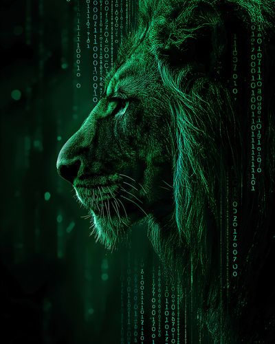 Plakat z serii pop art zatytułowany Kod Siły. Prezentuje majestatyczne oblicze lwa zanurzone w cyfrowym kodzie, który spływa w dół jak deszcz binarny, łącząc siłę i surowość natury z precyzją i logiką technologii. Zielonkawe światło podkreśla kontury i muskulaturę króla zwierząt, a cyfrowe elementy otulają jego profil, sugerując połączenie organicznego i syntetycznego świata. Ten plakat idealnie wpisuje się w nowoczesne, technologiczne przestrzenie, takie jak nowoczesne biura, pokoje gamingowe lub innowacyjne przestrzenie edukacyjne, oferując inspirację i refleksję nad współczesnym związkiem człowieka z technologią.