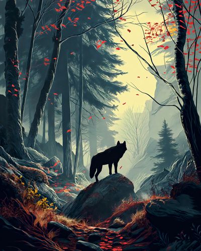 Plakat z serii natura zatytułowany Leśne Echa. Ilustracja przedstawia samotnego wilka stojącego na skale, który wpatruje się w mglistą dal tajemniczego lasu. Złote światło przebijające się przez drzewa nadaje scenie spokojną, ale zarazem majestatyczną atmosferę. Jesienne liście w odcieniach czerwieni kontrastują z chłodnymi tonami otoczenia, podkreślając zmienność sezonów. Plakat ten oddaje uczucie zadumy i połączenia z naturą, będąc idealnym dodatkiem do wnętrz, które cenią sobie spokój i dziką przyrodę, takich jak górskie chaty, saloniki z kominkiem lub przestrzenie wypoczynkowe.