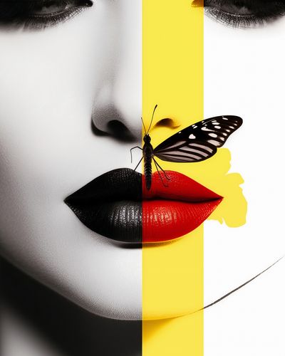 Plakat z serii abstrakcja zatytułowany Motyla Piękność. Ten plakat przedstawia twarz kobiety podzieloną na dwa kontrastujące segmenty: jeden w czerni i bieli, drugi w żywych kolorach z motylem na ustach. Ilustracja eksploruje temat dualizmu natury ludzkiej, piękna i jego zmienności. Plakat ten jest idealnym wyborem dla przestrzeni o współczesnym designie, takich jak salony piękności, studia artystyczne, a także jako wyrazisty element dekoracyjny w nowoczesnych domach.