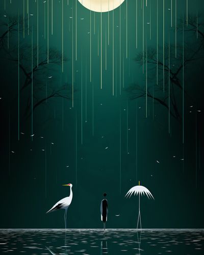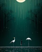 Plakat z serii wnętrza zatytułowany Nocne Marzenia. Scena przedstawia tajemniczą postać mężczyzny stojącego obok białej czapli, obaj są zanurzeni w wodzie i skierowani ku jasnoświecącemu księżycowi. Delikatne krople deszczu spadają z nieba, tworząc subtelną melodię natury, podczas gdy zarysy drzew rzucają cienie na monochromatyczne tło. Biały parasol unoszący się nad wodą dodaje elementu nieoczekiwanej magii i tajemniczości. Ta głęboka i metaforyczna kompozycja idealnie pasuje do nowoczesnych galerii sztuki, medytacyjnych przestrzeni oraz salonów czytania, gdzie cisza i kontemplacja dominują nad zgiełkiem codzienności.