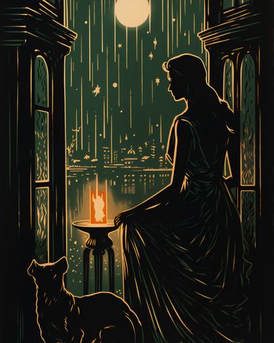 Plakat z serii pejzaże zatytułowany Nocne Szeptanie. Zadziwiająca sylwetka kobiety stojącej na balkonie, skąpana w świetle księżyca, jest podkreślana przez delikatne kontury jej sukni. Obok niej, wierny towarzysz w postaci kota, czuwa nad otoczeniem. Spokojna atmosfera miejskiej nocy na tle zorzy oraz migoczące gwiazdy nadają kompozycji niezwykłego uroku i głębokiej kontemplacji. Świetnie sprawdzi się w cichych kącikach czytelniczych, hotelowych lobby oraz w miejscach dedykowanych relaksowi i medytacji.