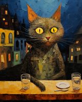 Plakat z serii abstrakcja zatytułowany Nocny Obserwator. Na tej ilustracji widzimy antropomorficznego kota siedzącego przy stoliku na tle nocnego, miejskiego pejzażu. Jego przenikliwe, żółte oczy i wyraziste, ostre kontury twarzy kontrastują z ekspresyjnymi, żywymi kolorami otoczenia. Artystyczny styl malowania, przypominający dzieła Van Gogha, nadaje scenie onirycznego, niemal baśniowego nastroju. Ten plakat z pewnością przyciągnie uwagę i stanie się wyjątkowym punktem centralnym w każdej przestrzeni, idealny dla miłośników sztuki, kreatywnych wnętrz oraz jako oryginalna dekoracja w kawiarniach i salonach.