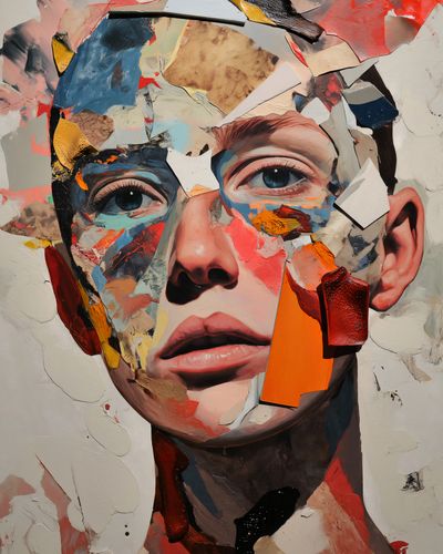 Plakat z serii abstrakcja zatytułowany Podział Samego Siebie, przedstawia twarz złożoną z rozmaitych, nieregularnych kawałków, które łączą się w zaskakująco spójną całość. Każdy fragment jest jak pociągnięcie pędzla, pełne tekstury i żywych kolorów, od ciepłych odcieni pomarańczy i czerwieni, po subtelne biel i brąz. Wzrok widza jest przyciągany do intensywnych, realistycznych oczu, które wydają się obserwować z za rozdrobnionej mozaiki. Plakat ten mógłby znaleźć swoje miejsce w nowoczesnych galeriach sztuki, studiach projektowych, lub jako odważny akcent w minimalistycznych, współczesnych przestrzeniach. Jego abstrakcyjny, ale wyrazisty design stwarza punkt konwersacyjny i może być interpretowany jako komentarz do złożoności ludzkiej tożsamości i percepcji.