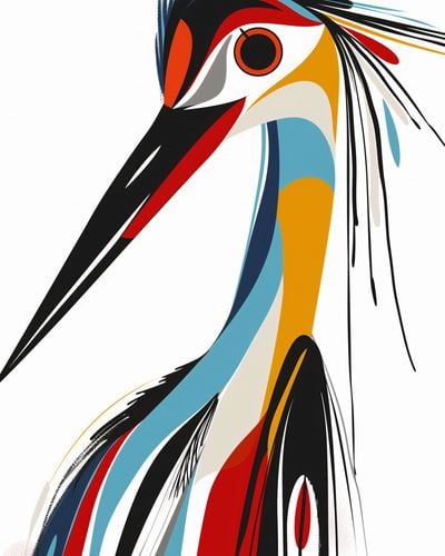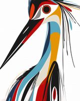 Plakat z serii abstrakcja zatytułowany Portret to abstrakcyjne przedstawienie bociana, w stylu modernistycznej grafiki. Ptak jest przedstawiony przy użyciu odważnych, czystych linii i jasnych, kontrastujących barw, które łączą się w dynamiczną i nowoczesną kompozycję. Linie tworzą zarys ptaka, a kolorowe płaszczyzny - od czerwieni, poprzez błękity, aż po odcienie żółci i czerni - nadają głębi i charakteru jego postaci. Akcenty kolorystyczne, jak czerwone pióro czy niebieski akcent na szyi, dodają dziełu energii i wyrazistości. Plakat jest żywy i pełen charakteru, idealny do wnętrz, które szukają silnego wizualnego akcentu, takich jak współczesne salony, galerie sztuki, czy przestrzenie kreatywne.