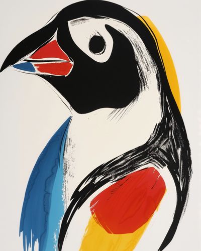 Plakat z serii abstrakcja zatytułowany Portret Ptaka. Prezentuje on stylizowany obraz ptaka, być może maskonura, z charakterystycznym dużym okiem i kolorowym dziobem. Artysta użył odważnych, geometrycznych kształtów i intensywnych barw, aby uchwycić esencję ptaka w prosty, ale wpadający w oko sposób. Duże bloki czerni, błękitu, czerwieni i żółci są zastosowane z lekkością pociągnięć pędzla, co nadaje dziełu lekkości i dynamiki. Ten plakat jest świadectwem tego, jak minimalizm może w pełni wyrazić piękno natury, będąc jednocześnie współczesnym i śmiałym elementem w każdym wnętrzu, od domowych przestrzeni po nowoczesne biura.