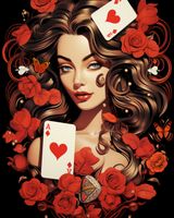 Plakat z serii abstrakcja zatytułowany Różany Hazard. Ta bogato zdobiona grafika przedstawia portret kobiety z królewskim spokojem, otoczoną przez wirujące karty z sercami i rozkwitające czerwone róże. Jej włosy płynnie przechodzą w kwiatowe motywy, a spojrzenie jest pełne tajemnicy i uroku. Motyle i drobne perełki dodają kompozycji element fantazji i delikatności. Wszystko to na tle głębokiej czerni, która eksponuje intensywność kolorów i detali. Plakat ten jest idealny dla przestrzeni, które chcą dodać element romantyzmu i wyrafinowania, jak eleganckie sypialnie, prywatne kolekcje czy luksusowe salony. Jego barwna paleta i symboliczne elementy sprawiają, że jest to dzieło, które przyciąga wzrok i pobudza wyobraźnię.