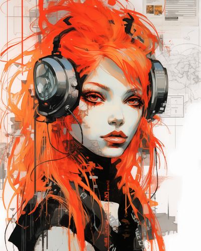 Plakat z serii pop art zatytułowany Rytm Metropolii. Dynamiczna kompozycja łączy portret kobiety o wyrazistych, pomarańczowych włosach z elementami miejskiego krajobrazu. Jej spojrzenie jest intensywne i pełne pasji, zaś duże słuchawki na uszach sugerują miłość do muzyki i rytmu wielkiego miasta. Abstrakcyjne linie i kształty, mieszające się z realistycznie oddaną postacią, tworzą wrażenie ruchu i pulsującej energii. To dzieło sztuki jest idealne dla miłośników muzyki, street artu i nowoczesnego designu, doskonale nadając się do wnętrz loftów, studiów muzycznych czy awangardowych salonów, które pragną podkreślić miejski charakter swojej przestrzeni.