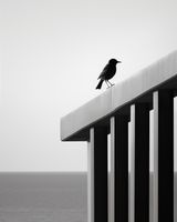 Plakat z serii pejzaże zatytułowany Samotna Odchłań. Ten skrajnie minimalistyczny obraz przedstawia pojedynczego ptaka spoczywającego na czystej, białej krawędzi konstrukcji, z subtelnym tłem nieskończonego morza. Zdjęcie w skali szarości, gdzie tylko kontury ptaka wyróżniają się na jednolitym tle, wywołuje poczucie spokoju i introspekcji. Idealny dla nowoczesnych przestrzeni biurowych i domowych, które pragną oddać hołd prostocie i skupieniu, a także jako przemyślany akcent w galeriach sztuki czy minimalistycznych salonach.