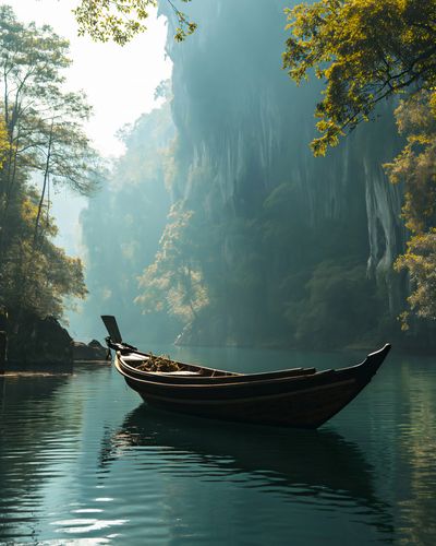 Plakat z serii pejzaże zatytułowany Samotność na Tafli przedstawia idylliczny krajobraz, w którym centralnym punktem jest drewniana łódka unosząca się na spokojnych wodach jeziora. Otoczona przez majestatyczne, zielone drzewa i klify, które otulają wodę jak opiekuńcze ramiona, scena ta jest utrzymana w ciepłych, naturalnych barwach. Promienie słoneczne przebijają się przez liście, tworząc efekt tajemniczego światła i cieni na wodnej tafli. Całość kompozycji wywołuje uczucie spokoju i kontemplacji, idealnie oddając atmosferę zacisznego zakątka, oderwanego od zgiełku codzienności. Plakat ten będzie pasował do wnętrz, które pragną podkreślić łączność z naturą i stworzyć oazę spokoju, takich jak gabinety relaksacyjne, pokoje medytacyjne czy nawet jako spokojny akcent w nowoczesnych biurach.