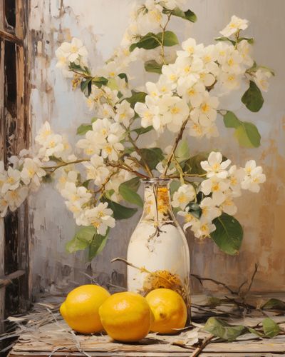 Plakat z serii wnętrza zatytułowany Słodkie Chwile. Delikatne białe kwiaty o subtelnym żółtym środku rozkwitają pełnym blaskiem obok dojrzewających cytryn, które wyróżniają się na tle w delikatnych pastelowych odcieniach. Starannie postarzana butelka i rustykalne drewno dodają nuty nostalgii i spokoju do tej kompozycji. Delikatna gra światła i cienia tworzy głęboką atmosferę i dodaje ciepła do sceny. Świetnie sprawdzi się w kawiarniach o prowansalskim stylu, domowych jadalniach dla tych, którzy pragną dodać do swojej przestrzeni odrobinę wiejskiego uroku, czy też w hotelach, gdzie chce się podkreślić elegancję i ciepło naturalnych elementów.