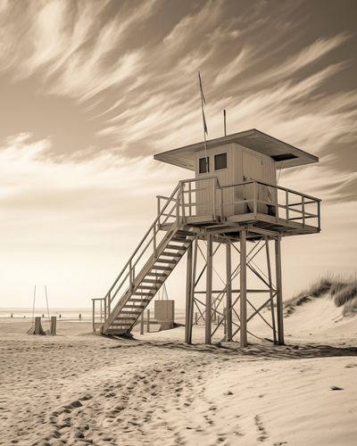 Plakat z serii pejzaże zatytułowany Strażnik Wydm. Prezentuje on sepiową scenę z wieżą ratownika na pustej plaży. Nostalgiczna tonacja obrazu podkreśla samotność struktury i piękno otaczającej ją dzikiej przyrody. Dramatyczne chmury na niebie i ślady na piasku prowadzą wzrok ku wieży, dodając głębi i historii miejscu. Ten plakat idealnie nadaje się do wnętrz, w których pragnie się wywołać uczucie spokoju, przestrzeni i czasów minionych, takich jak salony, pokoje wypoczynkowe, a także przestrzenie publiczne lub prywatne biura, które cenią sobie klasyczny wygląd i atmosferę.