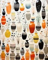 Plakat z serii wnętrza zatytułowany Symfonia Wazonów. Wspaniałe wazony w bogatej palecie kolorów, od głębokiej czerni do ciepłych odcieni pomarańczu, tworzą intrygującą mozaikę wzorów i kształtów. Delikatne motywy roślinne, które zdobią niektóre wazony, dodają uroku i lekkości, a różnorodność wzorów i faktur przyciąga wzrok i zaprasza do głębszej refleksji. Kontrast między jasnymi i ciemnymi barwami, a także subtelne niuanse w każdym wazonie, dodają tej kompozycji głębi i dramatu. Ten artystyczny plakat doskonale wpisuje się w klimat wyrafinowanych galerii sztuki, eleganckich kawiarni oraz nowoczesnych przestrzeni mieszkalnych, które stawiają na unikatowy design.