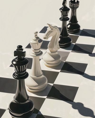 Plakat z serii abstrakcja zatytułowany Szach i Mat. Na plakacie widzimy fotorealistyczną kompozycję szachów w akcji. Białe i czarne figury są elegancko rozmieszczone na szachownicy, co sugeruje intensywność i strategię gry. Cienie rzucone przez figury na błyszczącą powierzchnię szachownicy nadają głębi i trójwymiarowości plakatu. Skupienie na kilku głównych figurach, takich jak wieża, hetman i skoczek, może symbolizować krytyczny punkt w grze, gdzie każdy ruch ma kluczowe znaczenie. Tło jest jasne i neutralne, co pozwala skupić się na dynamice gry bez rozpraszających elementów. Plakat ten mógłby być idealnym dodatkiem do przestrzeni dla miłośników szachów lub jako dekoracyjny element w przestrzeni wspólnej, bibliotece lub pokoju gier, dodając elegancji i intelektualnego charakteru.