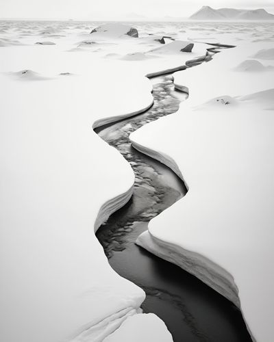Plakat z kolekcji pejzaże zatytułowany Meandry Mrozu. Ten plakat przedstawia sinący lodowiec, którego szczeliny przecinają śnieżnobiałą powierzchnię, tworząc naturalne dzieło sztuki. Monochromatyczna paleta barw, gdzie biel śniegu kontrastuje z głębokim czerniami wód lodowcowych, przemawia do wyobraźni i wywołuje uczucie surowości oraz majestatu natury. Doskonały do wnętrz o minimalistycznym designie lub jako mocny wizualny akcent w przestrzeniach takich jak salony, biura i lobby hotelowe, gdzie może inspirować do refleksji nad pięknem i siłą przyrody.
