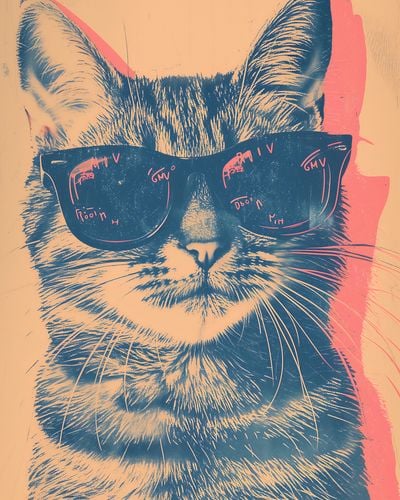 Plakat z serii abstrakcja zatytułowany Trendsetter. Na plakacie widzimy portret kota w stylowych okularach przeciwsłonecznych, z refleksami na soczewkach, które dodają mu tajemniczego uroku. Tło w odcieniach ciepłego różu i chłodnego niebieskiego nadaje kompozycji wibracyjny, niemal retro charakter. Grafika ta jest zabawnym, lecz wyrafinowanym akcentem dla każdego wnętrza, od domowego biura po salon. Idealny dla miłośników zwierząt i mody, a także jako lekki, humorystyczny element w przestrzeniach kreatywnych i galeriach sztuki.
