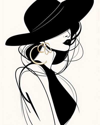 Plakat z serii minimalistyczne zatytułowany Uwikłana Elegancja. Grafika przedstawia sylwetkę tajemniczej, eleganckiej postaci w szerokim kapeluszu, co nadaje kompozycji aurę wyrafinowania i gracji. Stylizowany portret, wykonany czernią i bielą z akcentami złota, emanuje klasyką i nowoczesnością. Silny kontrast i płynne linie podkreślają zmysłowy kształt ujęcia oraz wytworność biżuterii, sugerując wyrafinowany gust i pewność siebie modelki. Plakat ten idealnie wpasuje się w eleganckie wnętrza, gdzie klasyka spotyka się z nowoczesnością, doskonale nadając się do salonów, sypialni, garderoby lub jako elegancki akcent w przestrzeniach komercyjnych, takich jak salony piękności czy butiki.