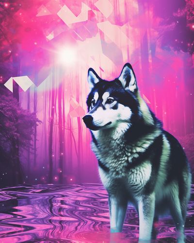 Plakat z serii pop art zatytułowany Wilczy Duch. Ta hipnotyzująca grafika łączy w sobie realistyczny wizerunek wilka z eterycznym, neonowym lasem w tle, co nadaje scenie onirycznego, mistycznego charakteru. Wilk, przedstawiony w pełnym majestacie, stoi na brzegu zaczarowanego jeziora, a tajemnicze, geometryczne kształty unoszą się w powietrzu, dodając kompozycji elementu fantastyki. Wyraziste kolory różu i fioletu tworzą niemal bajkową atmosferę. Plakat jest idealnym wyborem dla miłośników natury i jej mistycznych aspektów, świetnie nadaje się do wnętrz o tematyce przyrodniczej, pokojów dla młodzieży, lub jako unikatowy element dekoracyjny w przestrzeniach współczesnych.