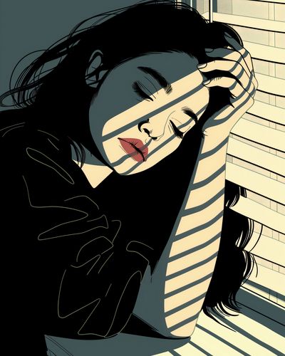 Plakat z serii abstrakcja zatytułowany Zamysł. Plakat przedstawia kobietę z zamyślonym wyrazem twarzy, z głową opartą na dłoni, co sugeruje moment introspekcji lub smutku. Silne cienie i linie świetlne tworzące prążki na jej twarzy dodają głębi kompozycji, a kontrastująca paleta kolorów z dominującymi odcieniami niebieskiego i czerni, podkreślona akcentem czerwieni ust, potęguje emocjonalne napięcie dzieła. Ten plakat może symbolizować skomplikowane emocje ludzkiego doświadczenia i jest idealnym dodatkiem do przestrzeni, które cenią sobie głębię i wyrazistość w sztuce, takich jak salon, studio twórcze, czy miejsce do medytacji.