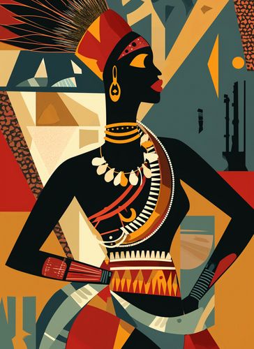 Plakat z serii abstrakcja zatytułowany Afrykańska Mozaika. Prezentuje on stylizowany profil afrykańskiej kobiety, ubranej w tradycyjne ozdoby i hełm, który jest równie bogaty w kulturę, co w estetykę. Tło i postać są zbudowane z geometrycznych kształtów i ciepłych, ziemistych kolorów, które oddają bogactwo i różnorodność afrykańskiego dziedzictwa. Złote i czerwone akcenty na postaci kontrastują z spokojnymi odcieniami tła, co podkreśla jej wyjątkowy charakter. Plakat ten będzie doskonałym dodatkiem do wnętrz, które chcą uczcić i wyeksponować bogactwo kulturowe, takich jak salony, przestrzenie społecznościowe czy miejsca o tematyce edukacyjnej i kulturalnej.