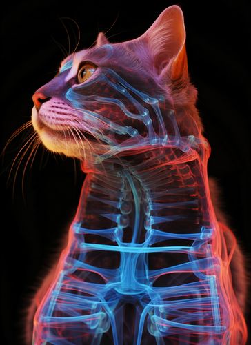 Plakat z serii pop art zatytułowany Anatomia Kota. Ta fascynująca grafika łączy w sobie sztukę i naukę, przedstawiając obraz kota z prześwitującym, kolorowym szkieletem. Praca eksploruje piękno ukryte w anatomii kota, podkreślając zarówno delikatność jak i złożoność jego budowy wewnętrznej. Dynamiczne, neonowe kolory nadają obrazowi nowoczesny, prawie kosmiczny wymiar. Plakat ten jest idealny dla weterynarzy, miłośników kotów, jak również stanowi wyjątkową dekorację w przestrzeniach edukacyjnych lub jako niezwykłe dzieło sztuki w domach i biurach.
