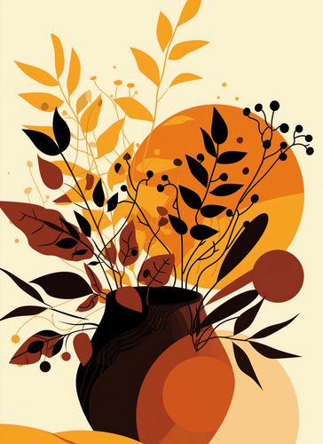 Plakat z serii minimalistyczne zatytułowany Bukiet Owoców. Grafika ta przedstawia estetyczny układ liści i owoców jesieni w klasycznym, ciemnym wazonie, umieszczony na tle ciepłych, okrągłych form w tonacji jesiennej palecie. Gama kolorów rozciąga się od intensywnego mahoń do miękkiego złota, przywołując uczucie ciepła, które towarzyszy złotej porze roku. Przemyślne rozpryski i drobne detale nadają całości dynamiki, sugerując żywotność i obfitość jesiennych plonów. Plakat ten idealnie odnajdzie się w przytulnych wnętrzach, wnosić będzie atmosferę spokoju i refleksji. Idealnie nadaje się do salonów, pokojów dziennych lub przestrzeni, gdzie dominuje naturalna paleta barw i materiałów.