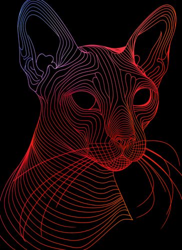 Plakat z serii pop art zatytułowany Cyfrowa Kocica przedstawia futurystyczny wizerunek kota sfinksa, wykonany za pomocą płynnych, abstrakcyjnych linii w odcieniach czerwieni i pomarańczu na głębokim, czarnym tle. Wzór linii tworzy iluzję trójwymiarowości i ruchu, podkreślając wyraziste cechy kociego profilu, takie jak duże uszy, wyłaniające się oczy i charakterystyczne rysy twarzy. Minimalistyczne użycie koloru i linii w kontraście z ciemnym tłem nadaje dziełu nowoczesny wygląd, który przyciąga wzrok i pobudza wyobraźnię. Ten artystyczny plakat świetnie wpisze się w wnętrza o nowoczesnym designie, szczególnie wśród miłośników zwierząt i miłośników sztuki cyfrowej, nadając przestrzeni odrobinę współczesnego stylu i kociego wdzięku.