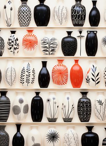 Plakat z serii wnętrza zatytułowany Gliniana Harmonia. Precyzyjnie ułożone wazony na półkach prezentują się niczym w muzeum sztuki użytkowej. Ich geometryczne i roślinne wzory, oscylujące między czernią, bielą i czerwienią, tworzą hipnotyzującą kompozycję. Prostota i elegancja tych przedmiotów, w połączeniu z ich zróżnicowaną fakturą i wzornictwem, dodają wnętrzom niepowtarzalnego charakteru. Idealnie komponują się zarówno w nowoczesnych loftach, jak i tradycyjnych pokojach kolekcjonera. Ta estetyczna kolekcja doskonale odda atmosferę w galeriach designu oraz w ekskluzywnych salonach z antykami.