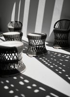 Plakat z serii wnętrza zatytułowany Gra Świateł to stylowa, monochromatyczna fotografia, która oddaje estetykę współczesnego designu. Na fotografii widzimy zestaw eleganckich, plecionych stołków z rattanu ustawionych na tle geometrycznych cieni. Ostre linie cieni przełamują okrągłe kształty mebli, tworząc fascynującą kompozycję pełną kontrastów. Białe siedziska stołków pięknie kontrastują z ciemniejszymi elementami, a gra światła i cienia nadaje scenie trójwymiarowość i teksturę. Plakat ten będzie doskonały dla miłośników minimalistycznych wnętrz, a także dla osób poszukujących elementu dekoracyjnego, który wprowadzi do pomieszczenia nowoczesny i artystyczny akcent. Idealny do nowoczesnych przestrzeni mieszkalnych, biur, kawiarni lub galerii sztuki.