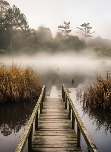 Plakat z serii pejzaże zatytułowany Most do Tajemnicy. Na tym mistycznym plakacie drewniana kładka prowadzi nas ku tajemniczej mgle, która delikatnie spowiła powierzchnię spokojnego stawu. Złote trzciny i zarysy drzew rzucają się w oczy na tle zamglonego poranka, tworząc uczucie ciepła i spokoju. Ten plakat oddaje piękno niewidzialnego świata, który czai się tuż za zasłoną mgły, zachęcając widza do refleksji i odkrywania nieznanego. Idealnie nadaje się do wnętrz, gdzie dominuje natura i spokój, takich jak salony spa, pokoje relaksacyjne, czy prywatne biblioteki. To wyjątkowy element dekoracyjny, który może przynieść element kontemplacji i odprężenia do każdego domu lub przestrzeni publicznej.
